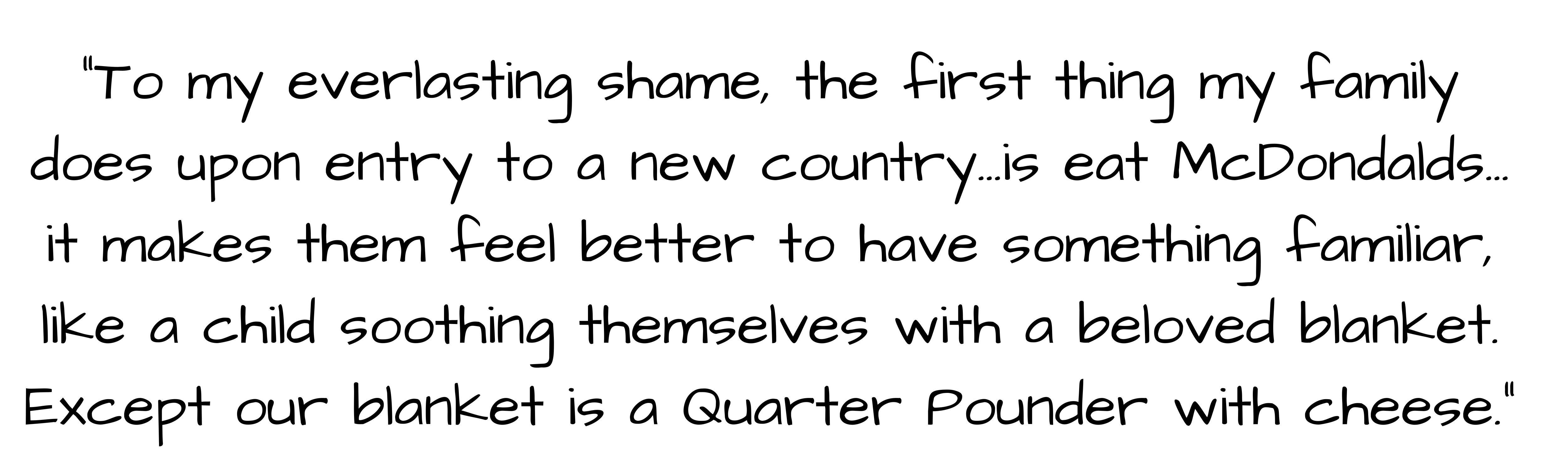 “We’re here to experience something new,” I used to complain. “We can get this at home.” I gave up fighting about it twenty countries ago. I figure it’s a way the family eases into the unknown. Invariably, we’ve just gone a night without sleeping, negotiated traffic and airports and new languages, and it makes them feel better to have something familiar, like a child soothing themselves with a beloved blanket. Except our blanket is a Quarter pounder with cheese.